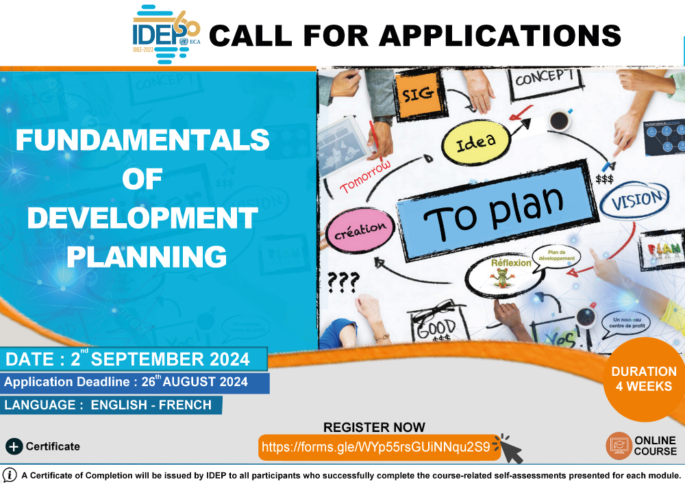 The African Institute for Economic Development and Planning (IDEP) is excited to announce the launch of its flagship course on the Fundamentals of Development Planning. This initiative is part of our commitment to improving public sector management and development planning, aimed at supporting the structural transformation of member States in line with the objectives of the African Union's Agenda 2063 and the United Nations Agenda 2030.