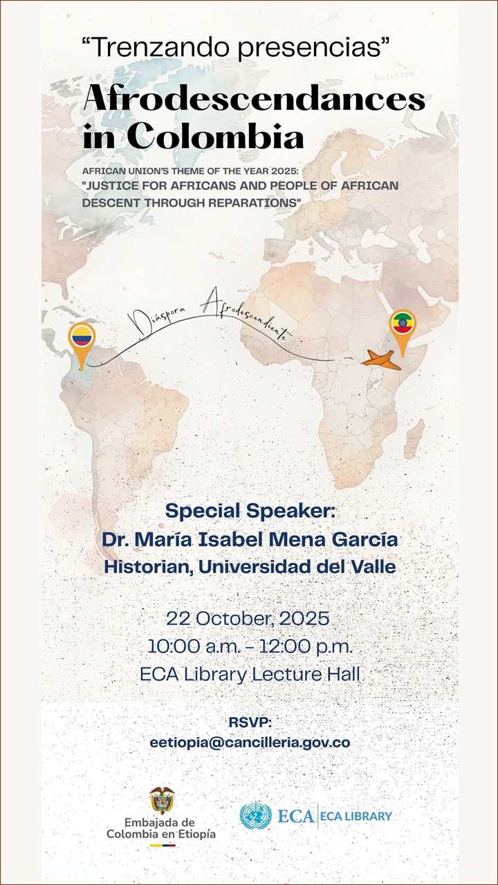 2025-10-22 October,22, 2025 ECA Library, UNECA Headquarters, Addis Ababa. ECA Library hosting a workshop on Afrodescendant Diaspora in Colombia Link to the Event https://knowledge.uneca.org/sites/default/files/Afrodescendant.png Organizers ECA